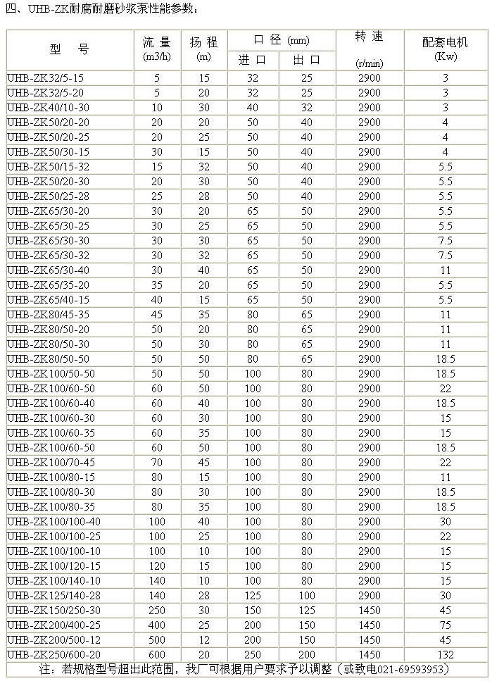UHB-ZK型耐腐耐磨砂漿泵![]() UHB-ZK型耐腐耐磨砂漿泵 更多信息一、產(chǎn)品概述: UHB-ZK耐腐耐磨砂漿泵屬懸臂式單級單吸離心泵采用鋼襯超高分子量聚乙烯制成,該材料是目前國際上新一代耐腐耐磨工程塑料;具有強大的耐腐蝕性和卓絕的耐磨性能。該泵 適用于溫度在100度以下,含固量(硬質(zhì)軟質(zhì)顆粒不限)不超過40%的任意濃度的酸、堿、鹽強氧化劑、有機溶劑等介質(zhì)的輸送. 二、設(shè)計特點: UHB-ZK耐腐耐磨砂漿泵系列產(chǎn)品專為輸送具有一定腐蝕性且含有細顆粒或有結(jié)晶的介質(zhì)而設(shè)計,采用鋼襯超高分子量聚乙稀模壓成型工藝制造,具有優(yōu)異的耐腐蝕性和卓越的耐磨性能,結(jié)構(gòu)設(shè)計為懸臂前開式,葉輪為半開式(無前蓋板),增強了流道內(nèi)的通過性,使介質(zhì)中的顆粒及雜質(zhì)很快通過泵腔而不會堵塞,軸封為K型氟橡膠密封環(huán)外帶冷卻水套,兼顧了耐腐與耐磨的雙重要求。