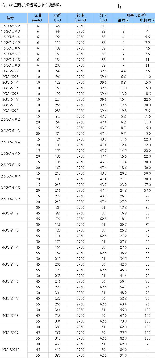 GC型臥式多級離心泵![]() GC型臥式多級離心泵 更多信息一、產品概述: GC型泵系臥式、單吸多級、分段式離心泵。 供輸送清水或物理化學性質類似于水的其它液體之用。 二、適用范圍: 適用于工業和城市給排水、高層建筑增壓供水,園林噴灌、消防增壓、遠距離送水、采暖、浴室等冷暖水循環增壓及設備配套等,尤其適用于小型鍋爐給水。 三、產品特點: 1、水力模型 , 2、泵運行平穩,噪音低。 3、軸封采用軟填料密封, 、結構簡單,維修方便快捷。 四、技術參數: 流量:5 揚程:46 功率:3-75KW; 轉速:2950r/min; 口徑:φ40-φ100; 溫度范圍:≤ 工作壓力:≤2.7Mpa。 五、型號意義: