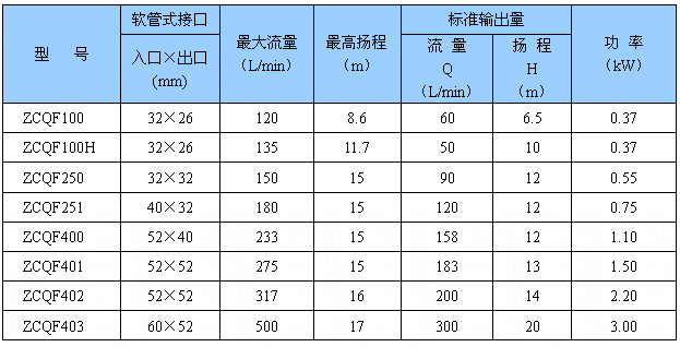 本泵采用外混式軸向回水泵體結構,泵體由吸液室、儲液室、蝸殼、回流孔、氣液分離室等部件組成。泵啟動后,在離心力的作用下,吸水室中的剩余液與進液管路中的空氣被葉輪攪拌成氣水混合物,混合物經蝸殼進入氣液分離室,隨著速度減慢,導致氣水分離,空氣由泵出液口排出,液經回水孔返回泵內,經過多次循環,進液管道中的空氣排凈,使泵內形成一定的真空度,達到自吸的作用。 五、性能參數: