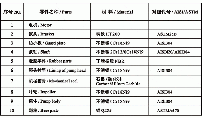 ![]() ZS型不銹鋼臥式單級離心泵材料對照表