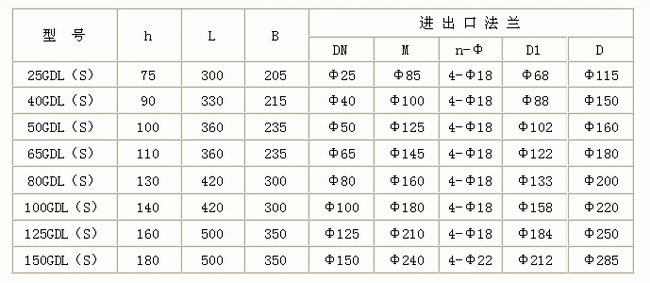![]() GDL型立式多級管道離心泵外形安裝尺寸表: