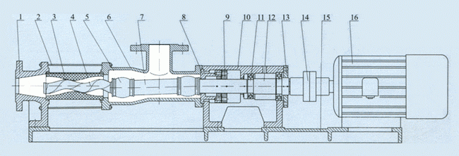 G型單螺桿泵|結構圖說明G型單螺桿泵結構圖說明:1、出料體2、拉桿3、定子4、螺桿軸5、萬向節或銷接6、進料體7、連接軸8、填料座9、填料壓蓋10、軸承座11、軸承12、傳動軸13、軸承蓋14、聯軸器15、底盤16、電機